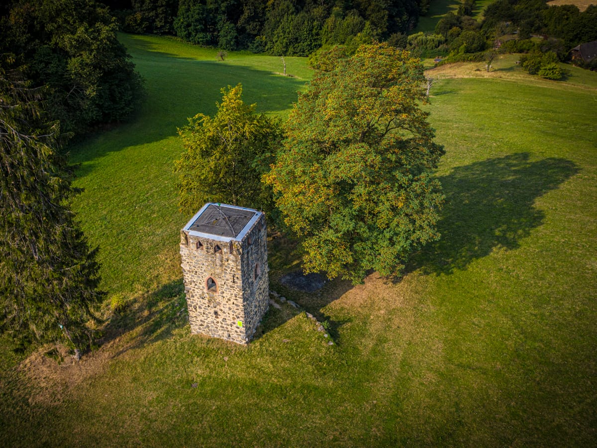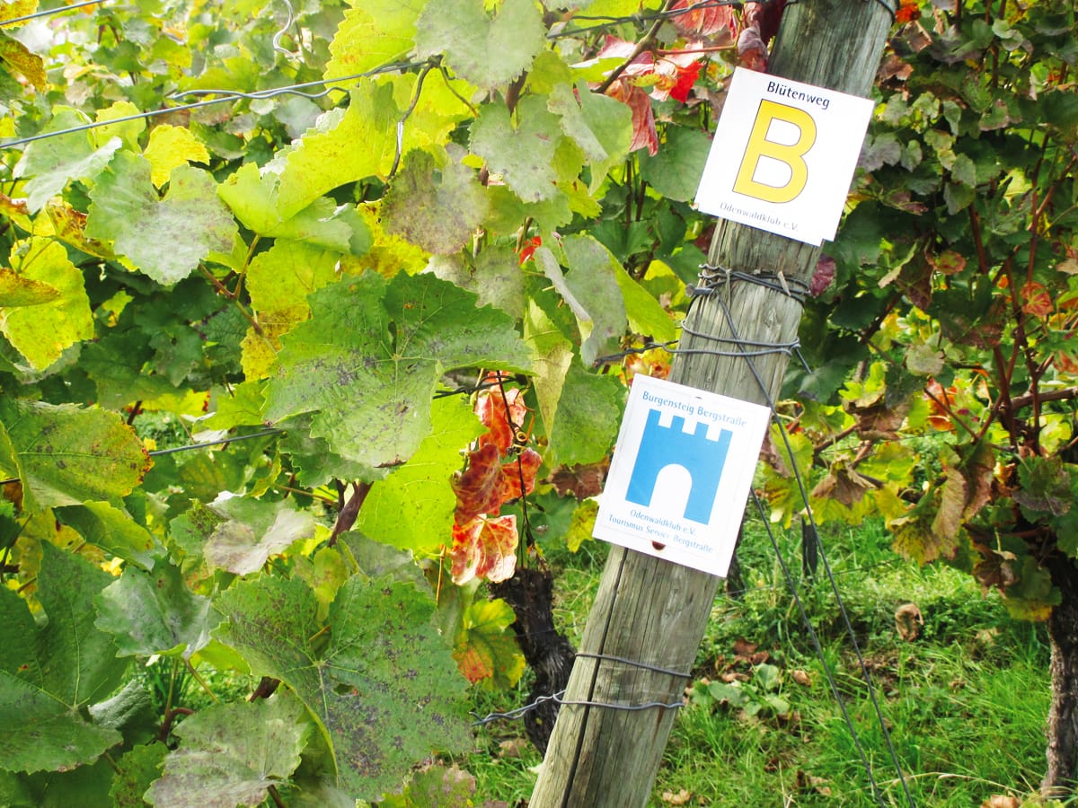 Dort biegt der Burgensteig vom Blütenweg ab und führt steil hinauf zum Hirschkopf. Oben befindet sich ein steinerner Aussichtsturm und ein Rastplatz. Auch nach dem anstrengenden Anstieg lohnt es sich, noch die Stufen zur Aussichtsplattform in 15 Meter Höhe zu bezwingen. Denn man wird mit einer großartigen Rundumsicht belohnt.